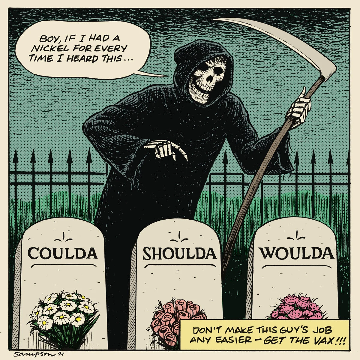 I was one of of 85 artists commissioned by the The City of Chicago’s Department of Cultural Affairs and Special Events (DCASE) in partnership with the Chicago Design Museum to participate in the “Protect Chicago” campaign. We were asked to create a piece that encourages Chicagoans to get vaccinated. Initially, I was going to do something like “Covid stops with you- get the vax!” But it quickly became apparent that even with the vaccine, one can still spread Covid. The big difference now is that the vast majority of hospitalizations and deaths are among the unvaccinated. So, I went with something a little more blunt 💀